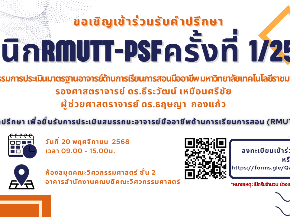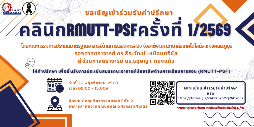 คณะวิศวกรรมศาสตร์ มทร.ธัญบุรี คว้ารางวัลรายการแข่งขัน ในงานราชมงคลวิชาการวิศวกรรมระดับชาติครั้งที่ 15 The 15th national Rajamangala Engineering Academic Contestสิงหาคม 6, 2024ผศ.ดร.ปิยนุช จริงจิตร ได้นำเสนอผลงานและแนวทางศึกษาต่อยอดจากงานวิจัยที่จดอนุสิทธิบัตร ต่อคณะอนุกรรมาธิการการอุดมศึกษา วิทยาศาสตร์ วิจัยและนวัตกรรม สภาผู้แทนราษฎรสิงหาคม 8, 2024 Published by ผู้ดูแล คณะวิศวกรรมศาสตร์ on สิงหาคม 8, 2024 Categories ข่าวประชาสัมพันธ์ ประกาศ Tags 2567engineeringrmuttคณะวิศวกรรมศาสตร์บริการวิชาการมทร.ธัญบุรี 7.1 ยกเลิกประกาศขาดทอด 66 -3 Share ผู้ดูแล คณะวิศวกรรมศาสตร์ Related postsพฤศจิกายน 4, 2025RMUTT-PSF คลินิกให้คำปรึกษาการยื่นประเมินสมรรถนะอาจารย์มืออาชีพ มทร.ธัญบุรีRead moreตุลาคม 29, 2025ประกวดราคาซื้อชุดระบบปรับอากาศแบบอินเวอร์เตอร์สำหรับห้องเรียน จำนวน ๑ ชุดRead moreตุลาคม 29, 2025วิศวะ มทร.ธัญบุรี คว้าคะแนน EdPEx 2567 สูง 272 คะแนน ตอกย้ำความเป็นเลิศด้านคุณภาพRead more