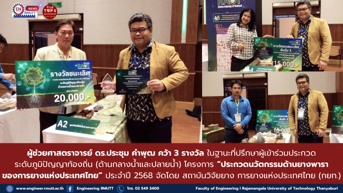 กันยายน 24, 2025ผู้ช่วยศาสตราจารย์ ดร.ประชุม คำพุฒ ที่ปรึกษาผู้เข้าร่วมประกวดจากภาควิชาวิศวกรรมโยธา มหาวิทยาลัยเทคโนโลยีราชมงคลธัญบุรี (มทร.ธัญบุรี) ได้รับรางวัลรวม 3 รางวัล จากเวที “ประกวดนวัตกรรมด้านยางพารา ของการยางแห่งประเทศไทย” ประจำปี 2568 จัดโดยสถาบันวิจัยยาง การยางแห่งประเทศไทย (กยท.) โดยนวัตกรรมที่ได้รับรางวัลสอดคล้องกับ เป้าหมายการพัฒนาที่ยั่งยืน (SDGs) หลายประการ ซึ่งมุ่งเน้นการสร้างมูลค่าเพิ่มให้กับทรัพยากรธรรมชาติ และส่งเสริมเศรษฐกิจหมุนเวียน