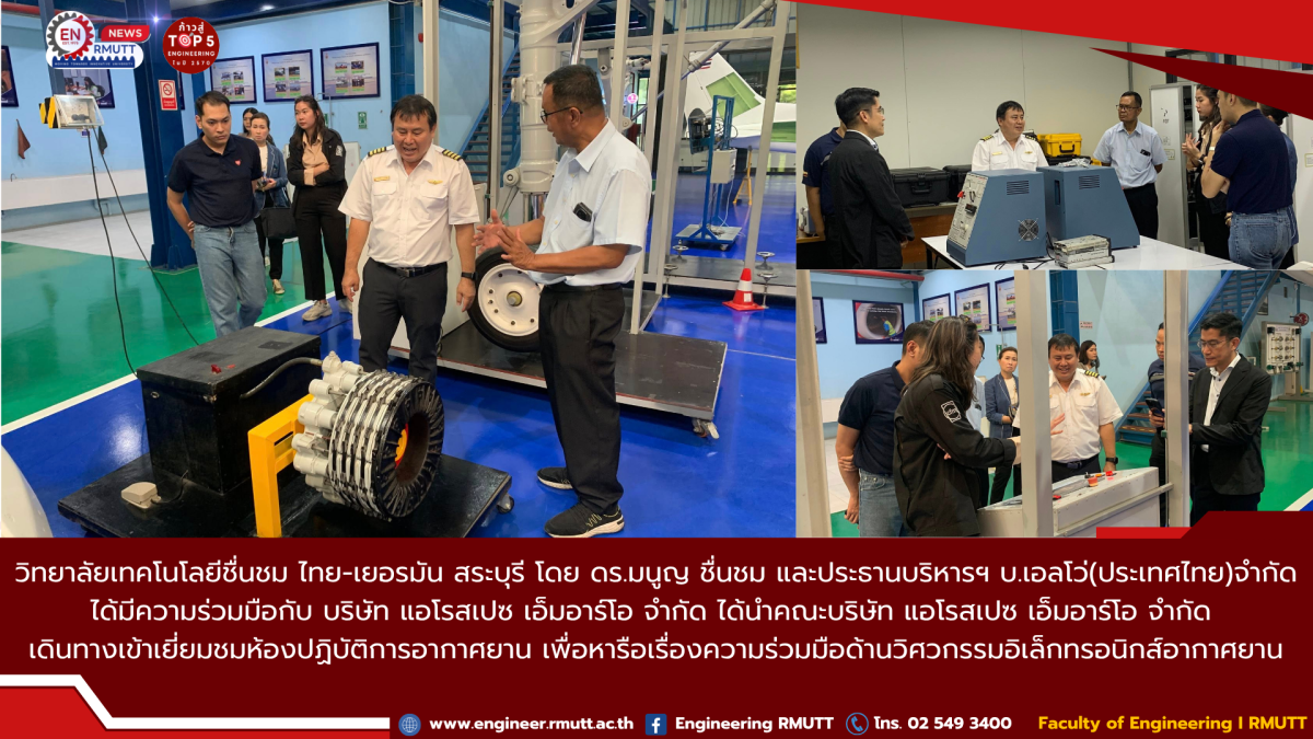 เมื่อวันที่ 7 ตุลาคม 2568 คณะวิศวกรรมศาสตร์ มหาวิทยาลัยเทคโนโลยีราชมงคลธัญบุรี (มทร.ธัญบุรี) ให้การต้อนรับคณะผู้บริหารจาก วิทยาลัยเทคโนโลยีชื่นชม ไทย-เยอรมัน สระบุรี นำโดย ดร.มนูญ ชื่นชม และผู้แทนจาก บริษัท เอลโว่ (ประเทศไทย) จำกัด พร้อมด้วยผู้บริหารจาก บริษัท แอโรสเปซ เอ็มอาร์โอ จำกัด ในโอกาสเข้าเยี่ยมชมห้องปฏิบัติการอากาศยานของคณะฯ .