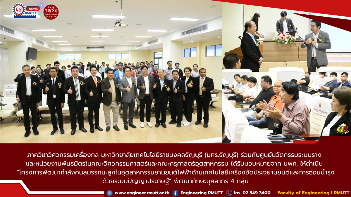 ภาควิชาวิศวกรรมเครื่องกล มหาวิทยาลัยเทคโนโลยีราชมงคลธัญบุรี (มทร.ธัญบุรี) ร่วมกับศูนย์นวัตกรรมระบบราง และหน่วยงานพันธมิตรในคณะวิศวกรรมศาสตร์และคณะครุศาสตร์อุตสาหกรรม ได้รับมอบหมายจาก บพค. ให้ดำเนิน “โครงการพัฒนากำลังคนสมรรถนะสูงในอุตสาหกรรมยานยนต์ไฟฟ้าด้านเทคโนโลยีเครื่องอัดประจุยานยนต์และการซ่อมบำรุงด้วยระบบปัญญาประดิษฐ์” ระยะเวลา 5 เดือน