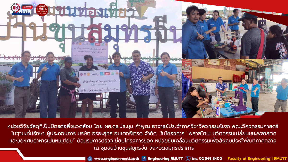เมื่อวันที่ 9 ตุลาคม 2568 ที่ผ่านมา หน่วยวิจัยวัสดุที่เป็นมิตรต่อสิ่งแวดล้อม โดย ผู้ช่วยศาสตราจารย์ ดร.ประชุม คำพุฒ อาจารย์ประจำภาควิชาวิศวกรรมโยธา คณะวิศวกรรมศาสตร์ มหาวิทยาลัยเทคโนโลยีราชมงคลธัญบุรี (มทร.ธัญบุรี) ในฐานะที่ปรึกษาโครงการฯ ได้ต้อนรับการตรวจเยี่ยมโครงการจากหน่วยขับเคลื่อนนวัตกรรมเพื่อสังคมประจำพื้นที่ภาคกลาง ณ ชุมชนบ้านขุนสมุทรจีน จังหวัดสมุทรปราการ