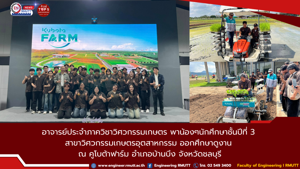 เมื่อวันที่ 10 ตุลาคม 2568 คณาจารย์ประจำ ภาควิชาวิศวกรรมเกษตร คณะวิศวกรรมศาสตร์ มหาวิทยาลัยเทคโนโลยีราชมงคลธัญบุรี (มทร.ธัญบุรี) ได้นำนักศึกษาชั้นปีที่ 3 สาขาวิศวกรรมเกษตรอุตสาหกรรม เดินทางไปศึกษาดูงาน ณ คูโบต้าฟาร์ม (Kubota Farm) อำเภอบ้านบึง จังหวัดชลบุรี