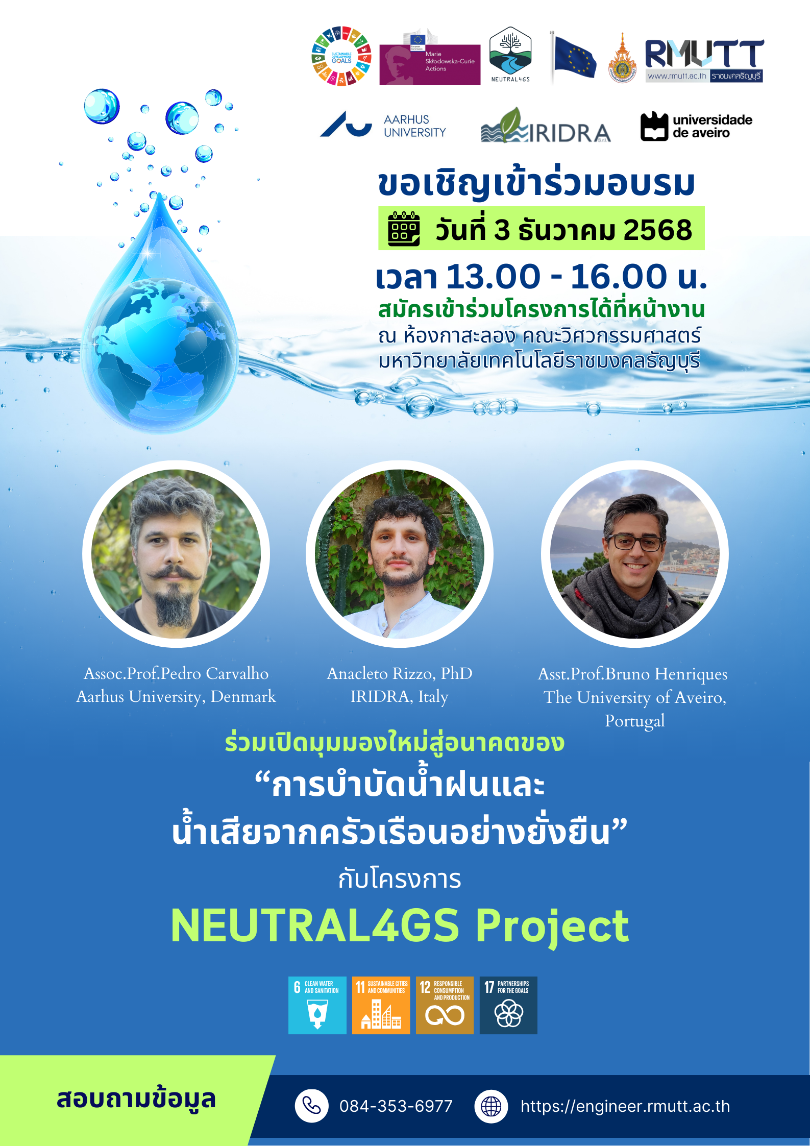 พฤศจิกายน 26, 2025“การบำบัดน้ำฝนและน้ำเสียจากครัวเรือนอย่างยั่งยืน” NEUTRAL4GS Project ขอเชิญทุกท่านเข้าร่วมงานอบรมพิเศษ พร้อมแลกเปลี่ยนองค์ความรู้กับผู้เชี่ยวชาญระดับนานาชาติจากยุโรป เพื่อขับเคลื่อนนวัตกรรมด้านน้ำสู่เป้าหมายการพัฒนาที่ยั่งยืน (SDGs)