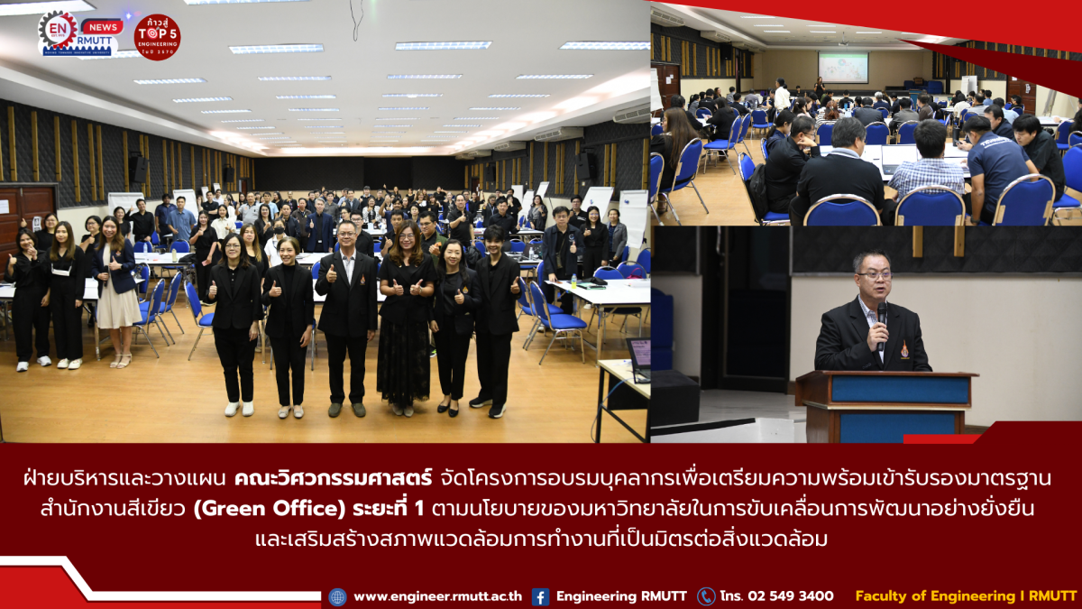 พฤศจิกายน 26, 2025ฝ่ายบริหารและวางแผน คณะวิศวกรรมศาสตร์ มหาวิทยาลัยเทคโนโลยีราชมงคลธัญบุรี จัดโครงการอบรมบุคลากรเพื่อเตรียมความพร้อมเข้ารับรองมาตรฐาน สำนักงานสีเขียว (Green Office) ระยะที่ 1 ตามนโยบายของมหาวิทยาลัยในการขับเคลื่อนการพัฒนาอย่างยั่งยืน และเสริมสร้างสภาพแวดล้อมการทำงานที่เป็นมิตรต่อสิ่งแวดล้อม