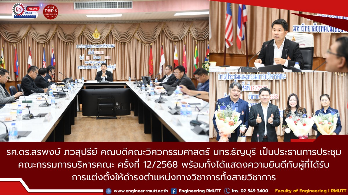 เมื่อวันที่ 16 ธันวาคม 2568 คณะวิศวกรรมศาสตร์ มหาวิทยาลัยเทคโนโลยีราชมงคลธัญบุรี (มทร.ธัญบุรี) จัดการประชุมคณะกรรมการบริหารคณะ ครั้งที่ 12/2568 ณ ห้องประชุมราชาวดี ชั้น 9 อาคารสำนักงานคณบดี