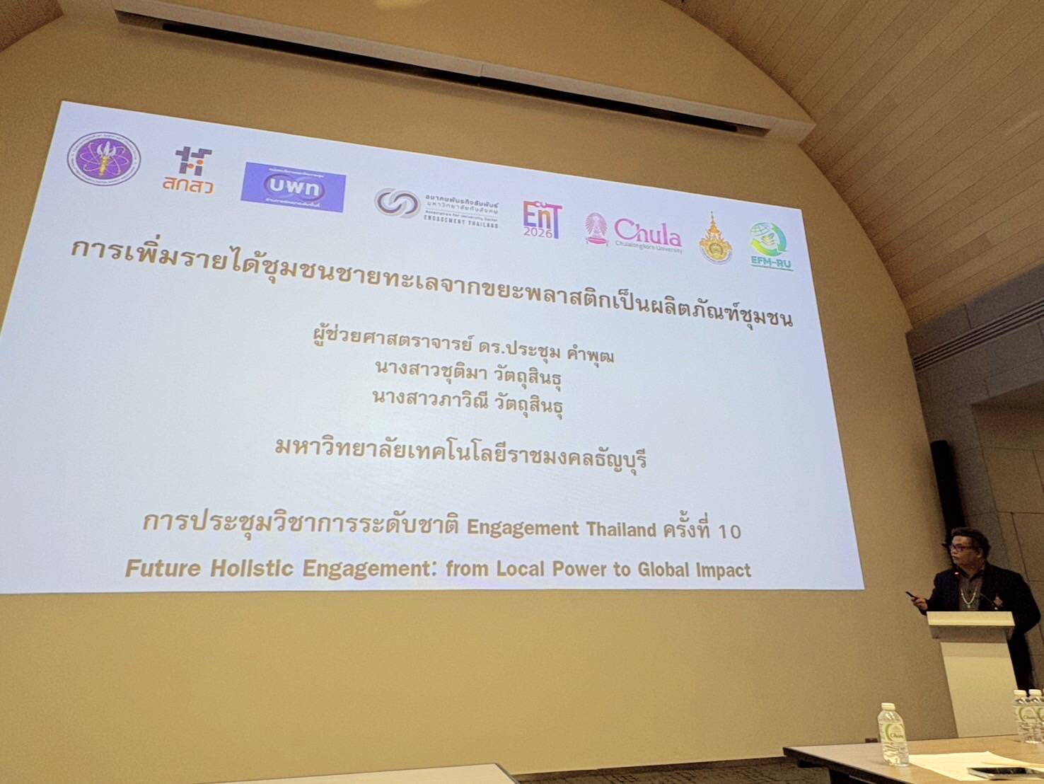 หน่วยวิจัยวัสดุที่เป็นต่อสิ่งแวดล้อม คณะวิศวกรรมศาสตร์ มหาวิทยาลัยเทคโนโลยีราชมงคลธัญบุรี โดย ผู้ช่วยศาสตราจารย์ ดร.ประชุม คำพุฒ และคณะ เข้าร่วมนำเสนอผลงานด้าน การมีส่วนร่วมของชุมชนในการจัดการขยะทะเลเพื่อสร้างรายได้แก่ชุมชน และการนำผลิตภัณฑ์ชุมชนมาจำหน่ายสู่ตลาด ณ ศูนย์การค้าสามย่านมิตรทาวน์