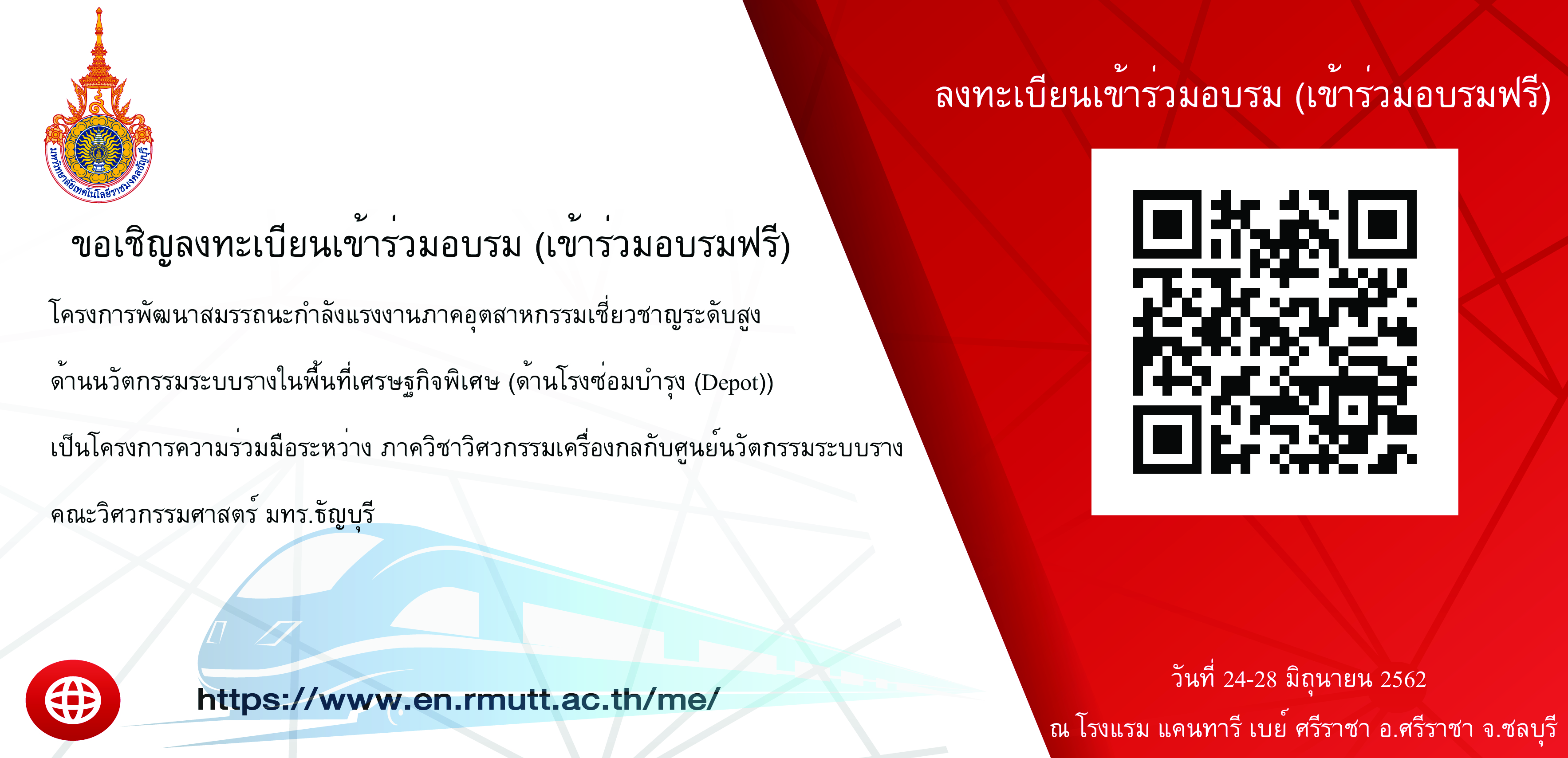 ขอเชิญลงทะเบียนเข้าร่วมอบรม (เข้าร่วมอบรมฟรี) โครงการพัฒนาสมรรถนะกำลังแรงงานภาคอุตสาหกรรมเชี่ยวชาญระดับสูงด้านนวัตกรรมระบบรางในพื้นที่เศรษฐกิจพิเศษ