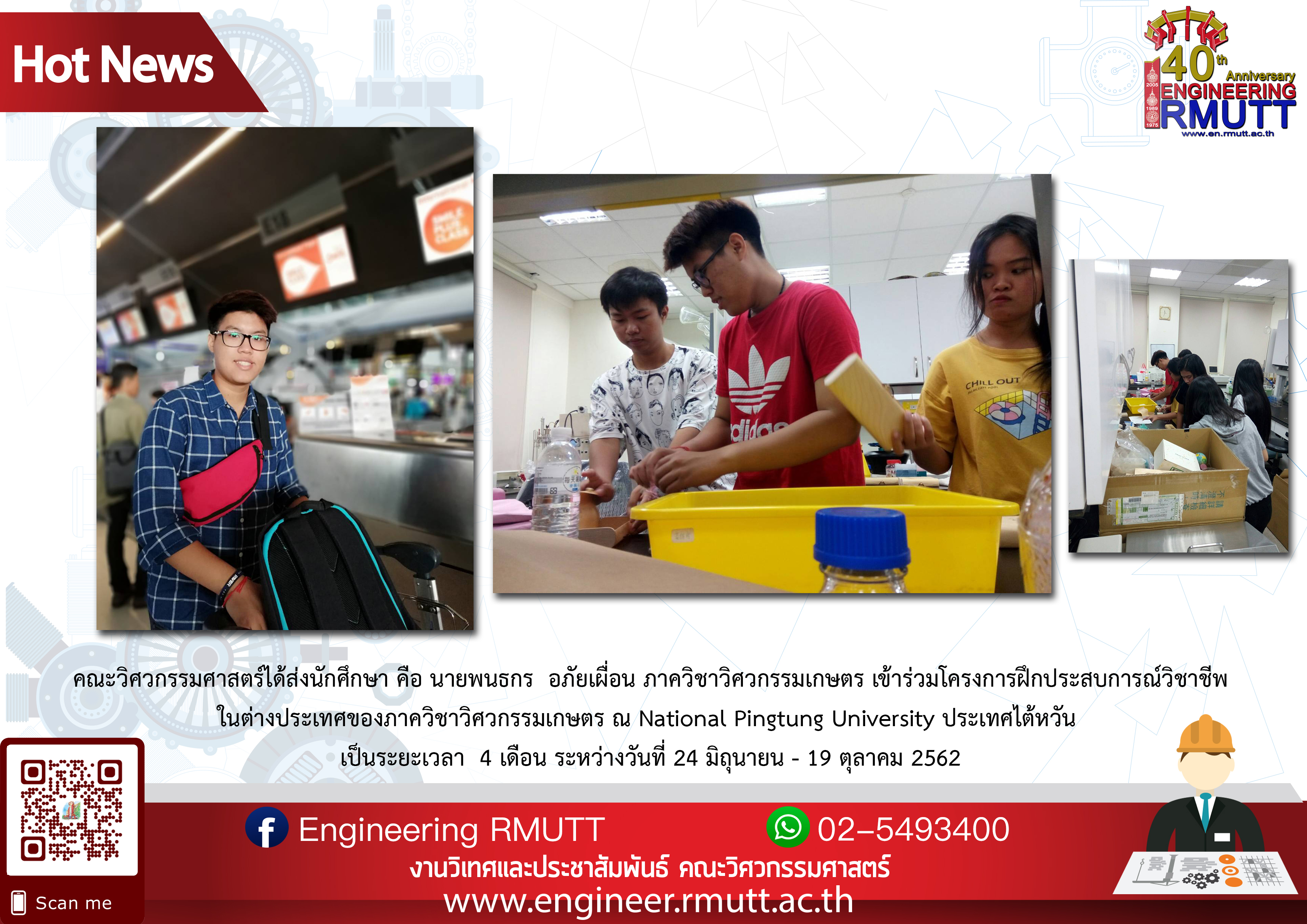 คณะวิศวกรรมศาสตร์ได้ส่งนักศึกษา Go Inter ฝึกประสบการณ์วิชาชีพในต่างประเทศ ณ National Pingtung University ประเทศไต้หวัน