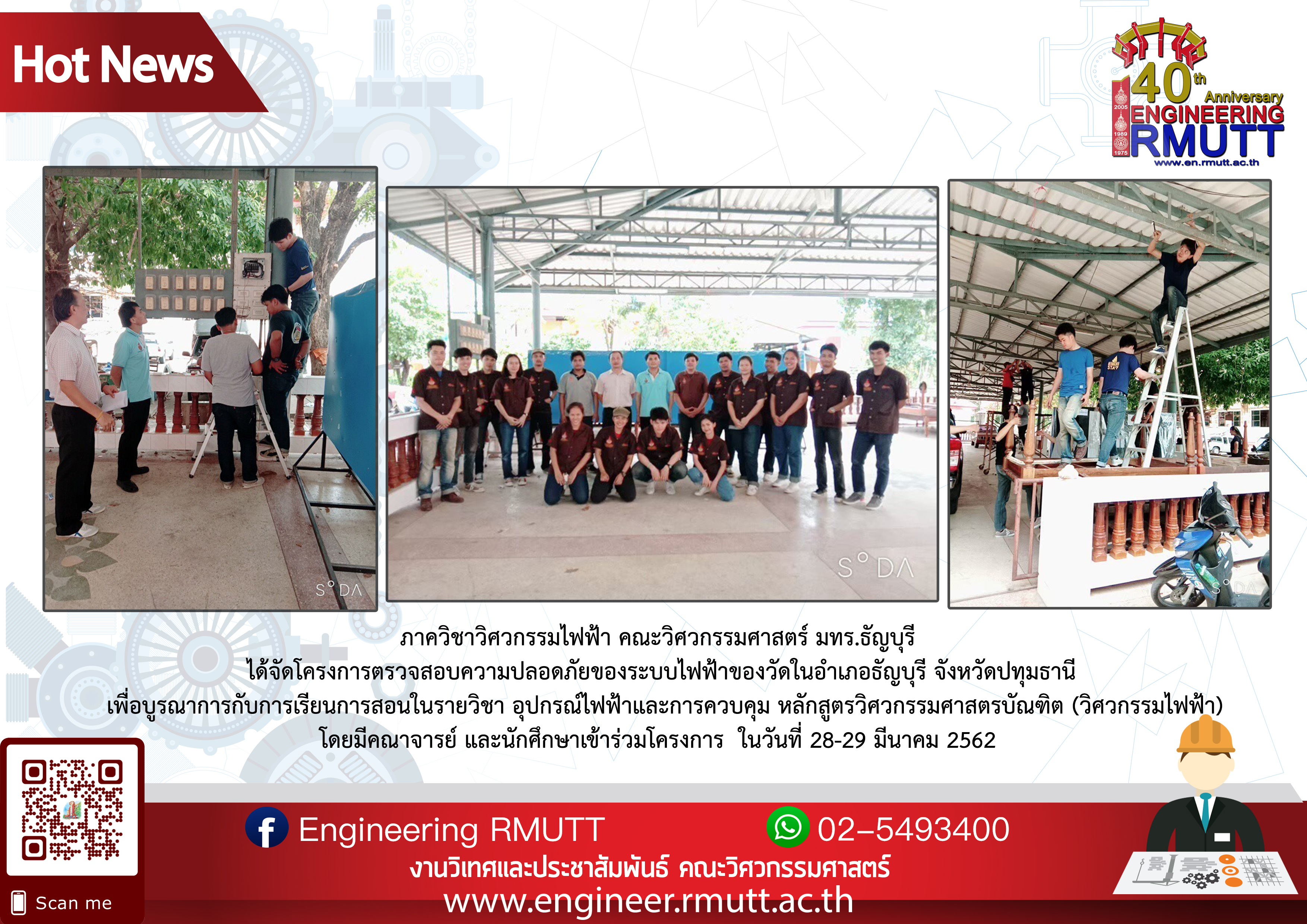 ภาควิชาวิศวกรรมไฟฟ้า คณะวิศวกรรมศาสตร์ มทร.ธัญบุรี ได้จัดโครงการตรวจสอบความปลอดภัยของระบบไฟฟ้าของวัดในอำเภอธัญบุรี จังหวัดปทุมธานี ในวันที่ 28-29 มีนาคม 2562
