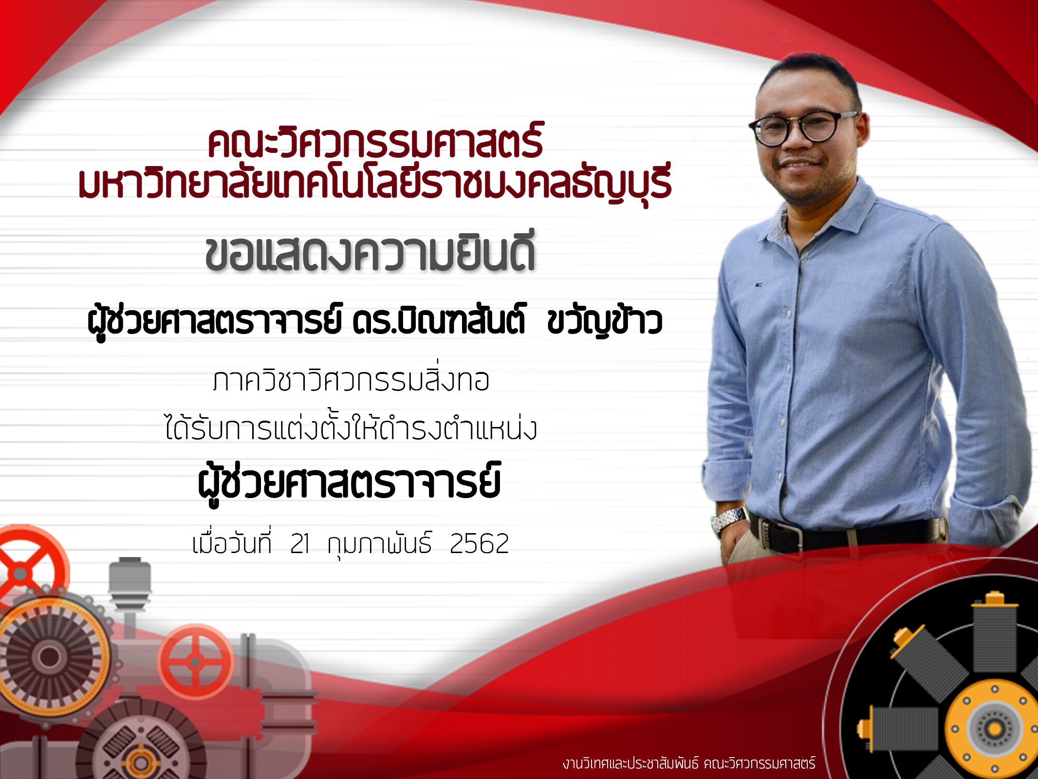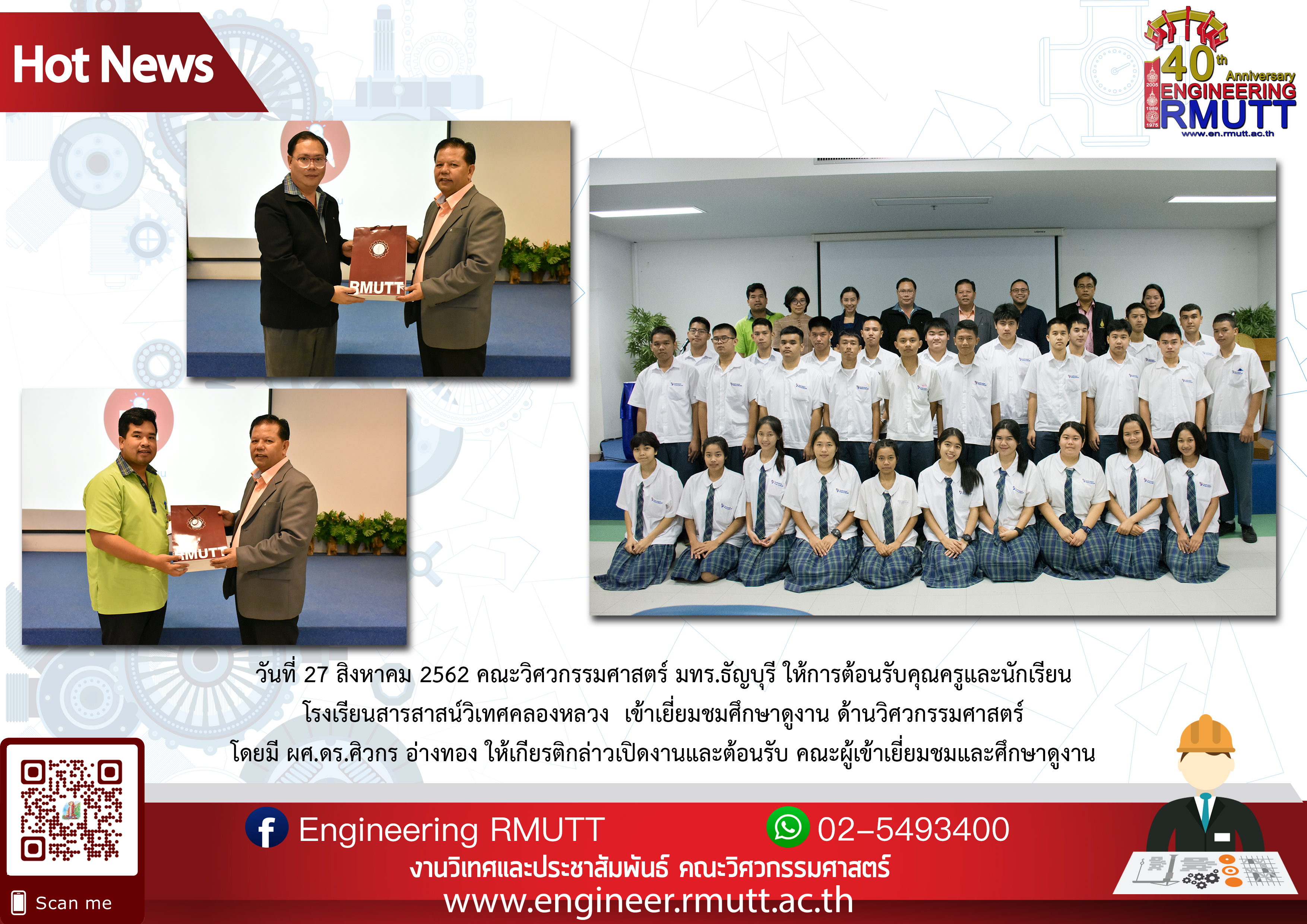 ขอแสดงความยินดีกับผู้ช่วยศาสตราจารย์ ดร.บิณฑสันต์ ขวัญข้าว ได้รับการแต่งตั้งให้ดำรงตำแหน่งผู้ช่วยศาสตราจารย์สิงหาคม 28, 2019ยินดีต้อนรับคุณครูและนักเรียน โรงเรียนสารสาสน์วิเทศคลองหลวง เข้าเยี่ยมชมศึกษาดูงาน ด้านวิศวกรรมศาสตร์สิงหาคม 28, 2019 Published by ผู้ดูแล คณะวิศวกรรมศาสตร์ on สิงหาคม 28, 2019 Categories ข่าวกิจกรรม Tags Share ผู้ดูแล คณะวิศวกรรมศาสตร์ Related postsมีนาคม 13, 2026วิศวะคอมพิวเตอร์ มทร.ธัญบุรี ศึกษาดูงาน SYNERGY GROUP เสริมสร้างแรงบันดาลใจด้าน AIoT และเซมิคอนดักเตอร์Read moreมีนาคม 11, 2026วิศวกรรมอุตสาหการ มทร.ธัญบุรี นำนักศึกษาศึกษาดูงานคลังสินค้าออฟฟิศเมท เสริมทักษะระบบ WMS และโลจิสติกส์อัตโนมัติRead moreมีนาคม 9, 2026วิศวกรรมเคมีและวัสดุ มทร.ธัญบุรี จัดโครงการถ่ายทอดความรู้ผลิตภัณฑ์ทำความสะอาดเพื่อทำนุบำรุงวัดมูลจินดารามRead more